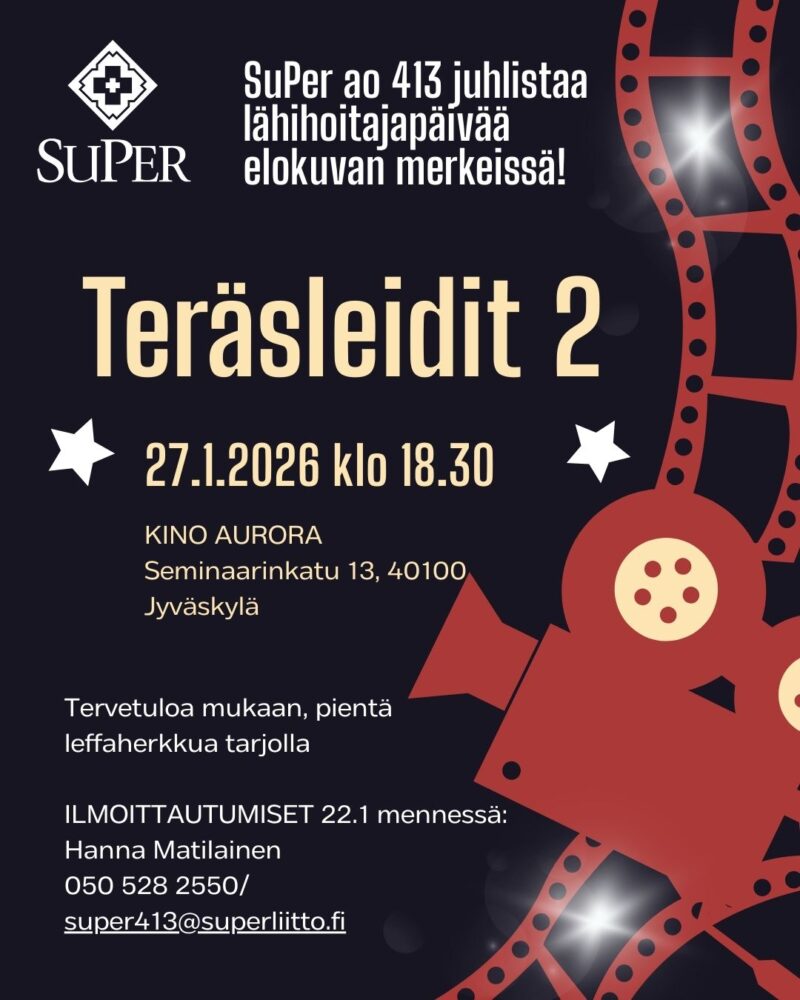 Ammattiosasto juhlistaa kansallista lähihoitajapäivää 27.1.2026 elokuvan merkeissä. Tervetuloa mukaan. Elokuvana Teräsleidit 2. KINO AURORA, Osoite: Seminaarinkatu 13, 40100 Jyväskylä