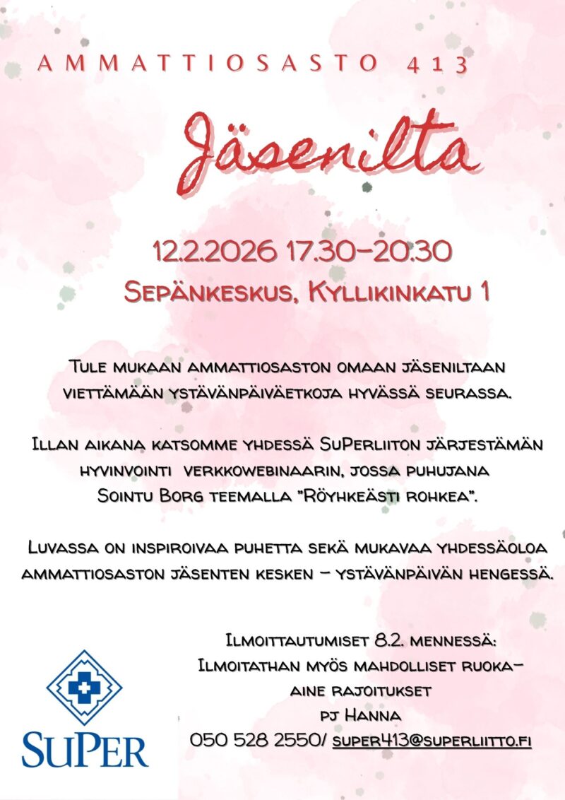 Tapahtumat Tapahtumat 12.2.2026 Jäsenilta2.3.2026 Jäsenilta23.3.2026 Yksityispuolen jäseniltaMenneet tapahtumat 17.5.2025 Hyvinvointi ilta – Lempeä Jooga & Äänimaljarentoutus! 21.8.2025 Päijänne risteily 24.11.25 Syyskokous 27.1.2025 Lähihoitajapäivän Leffailta 27.1.2026 Kansallinen lähihoitajapäivä 28.4.2025 Sääntömääräinen kevätkokous 30.11.25 Lempeä jooga ja äänimaljarentoutus 8.12. Katse ikääntyneiden palveluiden työpaikkoihin 12.2.2026 Jäsenilta