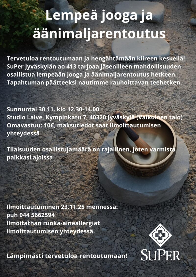 Tapahtumat Tapahtumat 1 Tapahtumat 2025 24.11.25 Syyskokous 30.11.25 Lempeä jooga ja äänimaljarentoutus2 Menneet tapahtumat 17.5.2025 Hyvinvointi ilta – Lempeä Jooga & Äänimaljarentoutus! 21.8.2025 Päijänne risteily 27.1.2025 Lähihoitajapäivän Leffailta 28.4.2025 Sääntömääräinen kevätkokous 30.11 Lempeä jooga ja äänimaljarentoutus
